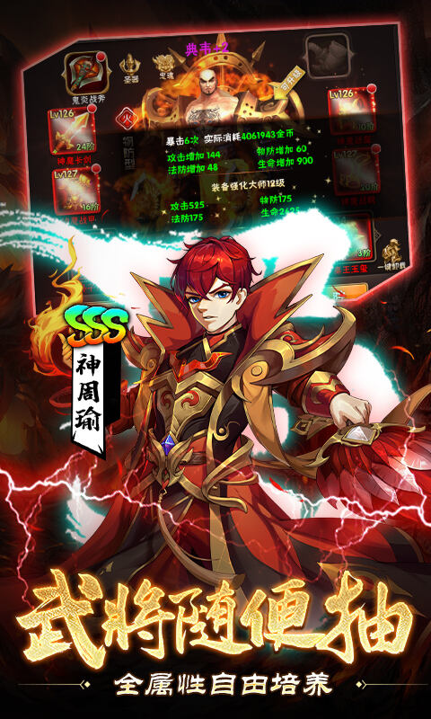 1、升级天天送6480代金券,免费畅玩! 2、全场充值首续0.1折,充值比例1:50,全场常规物价,首充多倍!海量元宝拿个够! 3、一键自动闯关解放你的双手不肝不氪制霸三国! 4、登录拿极品武将,在线登录拿海量资源