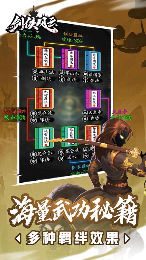 2 从64种武功中随机选取学习,通过搭配门派与职业羁绊形成专属战斗流派