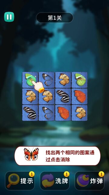 1. 玩家需在杂乱的图案矩阵中,找出两个完全相同的蝴蝶翅膀,点击选中后若连线不超过三条且不穿过其他图案,即可成功消除。