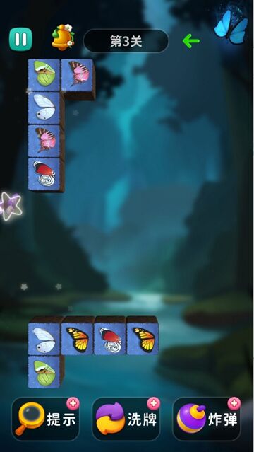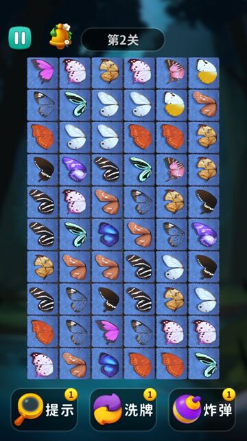 2. 炸弹道具可直接消除任意一对相同图案,洗牌道具能重新排列所有剩余图案,提示道具会高亮显示一组可消除的蝴蝶翅膀。