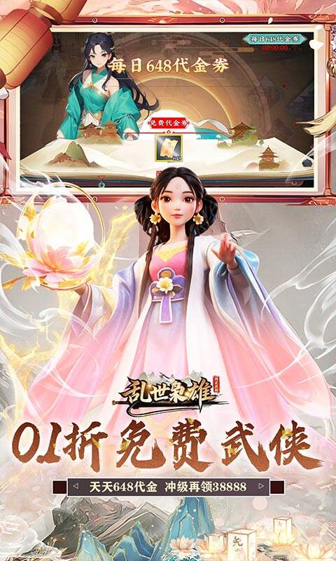 0.1折纯正武侠卡牌手游《乱世枭雄》全新上线!登录送终极神话侠客,每日免费648代金,江湖之路再送38888代金,武林豪侠、宗师每日免费领,1000连抽20万元宝闯关全白送!群侠结义共闯江湖,数百位知名江湖侠客悉数登场,激活缘分飙升战力,百余种精妙武学相生相克,神兵利器相辅相成,群侠对决快意恩仇,仿佛置身于一个真实的武侠世界!集天下绝学,习成名绝技,一统武林,傲视群雄!