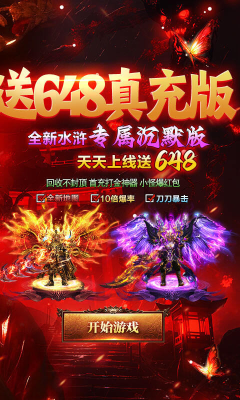 1、上线福利:开局送职业高阶技能,自动回收,自动拾取 2、天天648:每天登录领取648充值卡,激活线上累充活动 3、至尊特权:打怪爆灵符免费开通梁山之王至尊,属性爆涨 4、终生福利:打怪爆投名状免费升级梁山好汉等级,丰厚奖励免费领 5、七日登录:7日登录领取大量充值红包,丰厚养成材料 6、超高爆率:所有道具全靠打,小怪也能爆神装