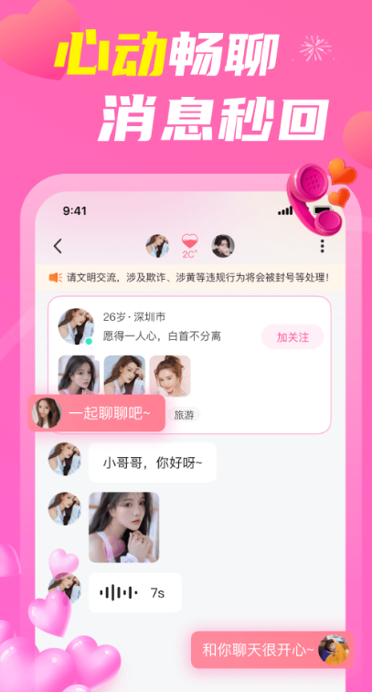 2、通过智能AI匹配算法,我们可以快速为你推荐彼此善意的异性,信息高效秒回;