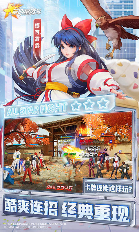 《全明星激斗》集结多系列IP,重燃青春热血!经典必杀炫酷动效,每次出招都是高能!多元阵容随心配,无损继承良心养成,全员皆可升级顶配!更有全新潮流原创格斗之城,轻松休闲一番街玩法,回归纯粹乐趣!一起重拾最初的记忆,招募你的格斗天团!