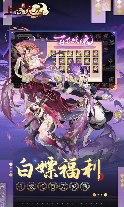 1.返代金券:0.05折直购礼包送代金券,登录再送限定灵妖,推图闯关无压力! 2.2048连抽:全新福利大放送!上线即送2048连抽,游戏内充值全部0.05折; 3.升级豪礼:豪送百万妖魄,达到指定等级即可领取,真正百万妖魄补贴! 4.凌霄玄女:购买开局礼包直升20级,史诗套装,凌霄·玄女等道具; 5.限定灵妖:持续更新限定灵妖和相关系列活动;