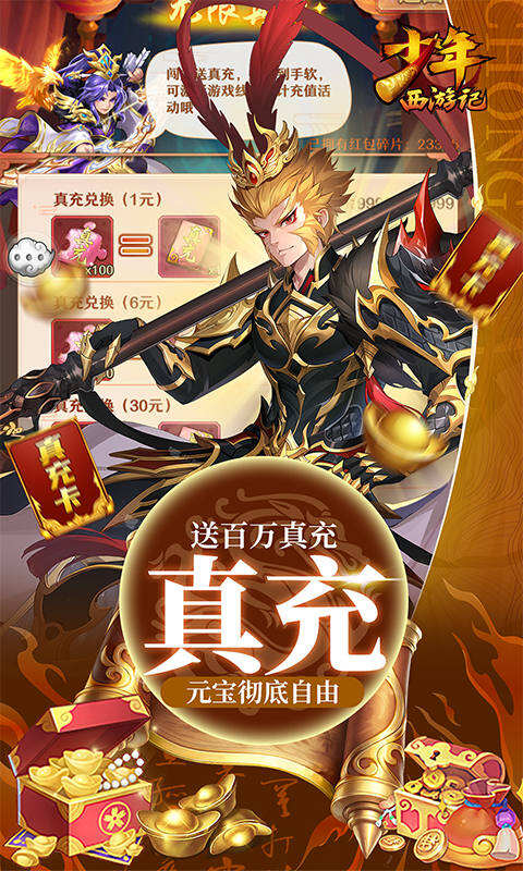 西游风华,少年无双 4亿玩家都在玩的《少年西游记(焰金免费版)》福利升级版已全新上线,玩就送焰金毕业阵容,每天领免费充值;全民冲级,狂送百万真充卡;返利商城0.1折豪礼钜惠 每日百抽无限爽抽神将;送5+5满星神将法宝 送主角直升皓金材料;GM指令 修改游戏数据 道具刷刷刷;全服共享充值进度,集全服之力于己身,百万累充奖励免费领;送自动推图,解放双手一键托管,内置加速器,8倍助力加速。单手轻松操作,爽快通关激斗,酷炫法宝合击,唯美清新画风,海量福利放送…你不可以错过的年度爆款!
