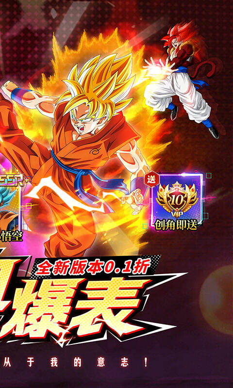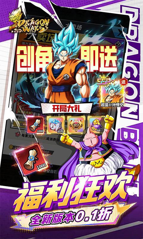 1、游戏内永久0.1折充值,648元秒变6.48元,全民皆可当大佬~ 2、开局即送神超级赛亚人之超蓝孙悟空 3、创角赠送VIP10、钻石*十万,银币*五百万,海量资源拿到手软 4、天天1000抽,连送7天 5、新服庆典签到豪礼送不停