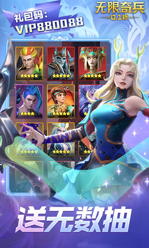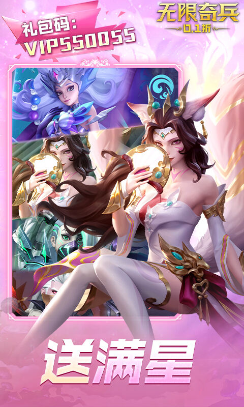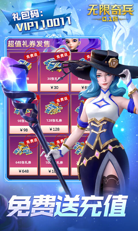 1、全场0.1折,真0.1 活动随便买 2、天天送充值,每日免费代金券 3、送强力英雄妲己,首充免费买 4、送满星英雄,送经典满星,充值比例1:10 5、每天白嫖海量货币,良心运营。 6、英雄快速升星 极速培养版本。 7、线下充值返利,奖励拿到手抽筋。线下活动礼包,让你一步登顶! 8、线上线下活动双重出击不停歇,福利满满!