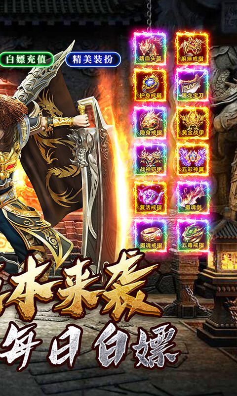 1、上线送自动回收,全屏拾取,自动挂机 2、免费领绝版时装,专属称号,满级赞助,群体雷电,超多材料 3、每日抽超高爆率,免费实物物资 4、在线奖励,实物回收,杀怪奖励,个人首爆,全服首爆,超多福利