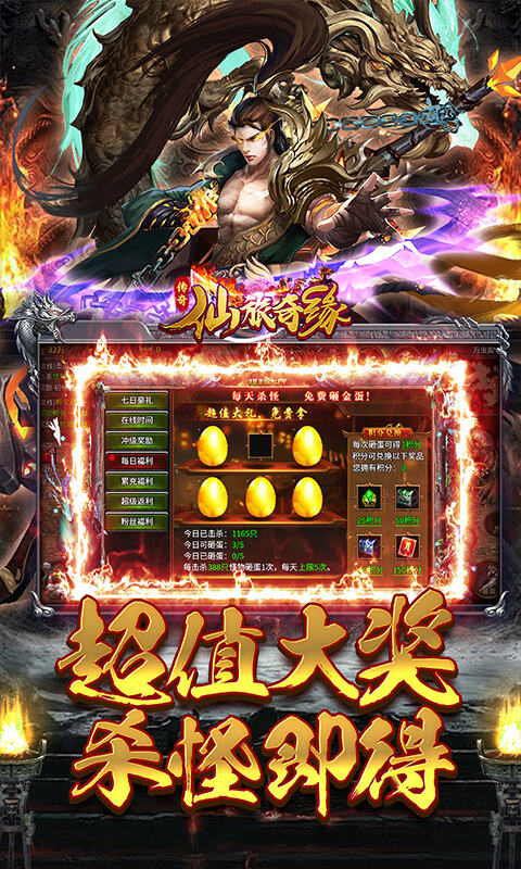 1、超值大奖,杀怪砸金蛋 2、保值回收,实物换真充 3、免费白嫖,打怪领赞助 4、首爆奖励,无限领元宝