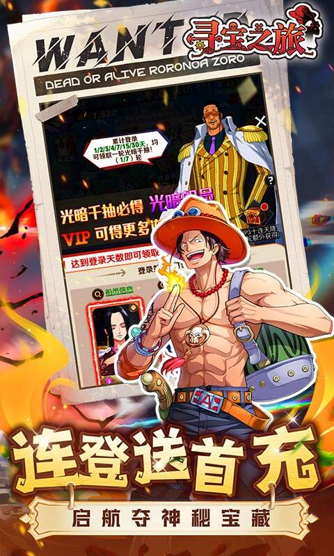 1、上线即送满星路飞,霸气开打,一拳破屏,战力直接拉满! 2、次日送·雷神艾尼路——响雷果实觉醒,雷电制裁,全屏秒杀! 3、七日送·女帝汉库克——甜甜果实秒控全场,美貌与战力并存,魅力倾城! 4、升级送万元充值卡,边玩边领,最高可得10000元返利额度! 5、免费送1000连抽,抽卡爽翻天,稀有伙伴轻松入手! 6、登录第二天直接送首充礼包,强力资源一键到手!