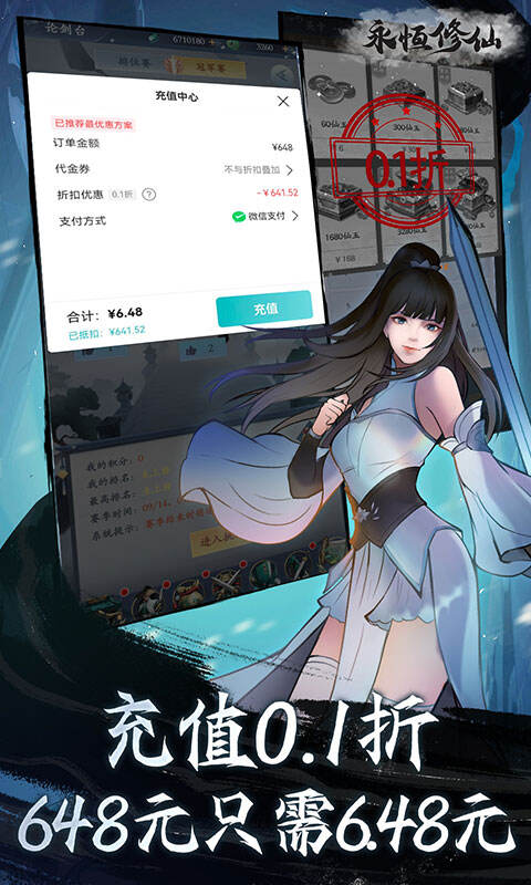 1.拒绝数值膨胀,永享0.1折优惠,每笔648元仅需6.48元! 2.登录免费送极品神剑,自由搭配助你快速通关! 3.每日躺平挂机即可免费获得海量修仙资源! 4.完成活跃免费探宝,海量道具等你解锁哦! 5.线上线下活动双重出击不停歇,超值福利满满!