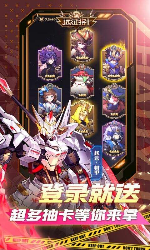 《远征将士》是一款新潮机甲三国放置卡牌手游。集策略,战斗、割草于一体,全新战斗机制,武将自定义养成,打造专属阵容,养成资源0损耗,6V6经典回合战斗,助你闯荡不一样的三国,这个三国有点燃! 返利说明
