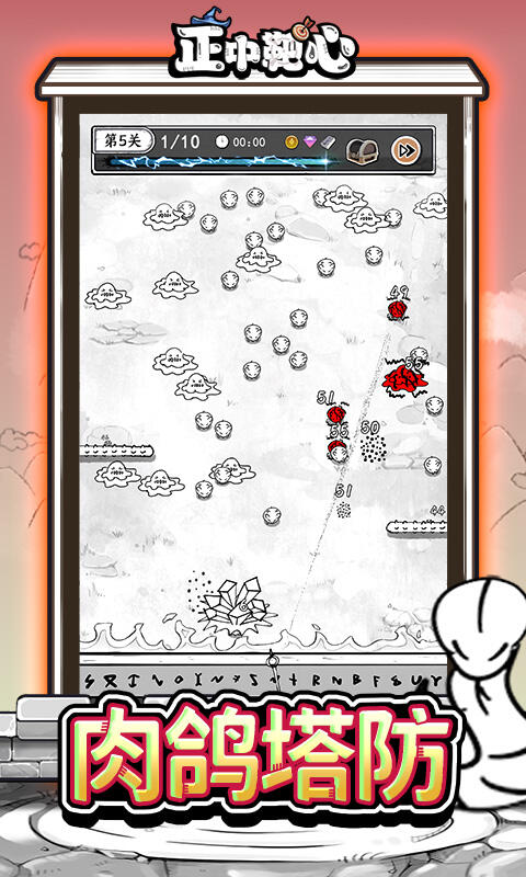 正中靶心是一款肉鸽塔防。一大波怪物源源不断的来攻打城堡,你能守住吗? 游戏特色: * 简单易上手,一分钟就上手,玩一局就沉迷 * 无需走位操作,只需要选择技能,手残党也能玩的很开心 * 技能丰富多样,升级路线也是完全不同,有丰富的套路可以玩 * 宝石随机掉落,随时随地有惊喜 * 装备技能自由组合和搭配,永远都有你想不到的玩法 * 玩法丰富:工坊、图鉴、城墙升级、学徒、无尽模式、爬塔玩法、挑战试炼,还有大量玩法开发中
