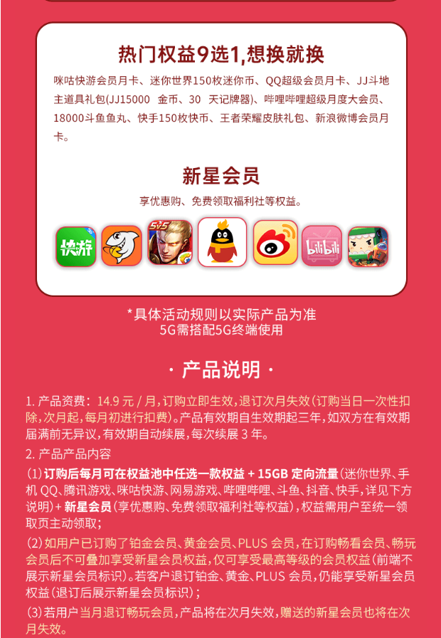 咪咕快游会员月卡、迷你世界150枚迷你币、QQ超级会员月卡、JJ斗地主道具礼包(JJ15000金币、30天记牌器)、哔哩哔哩超级月度大会员、18000斗鱼鱼丸、快手150枚快币、王者荣耀皮肤礼包、新浪微博会员月卡。