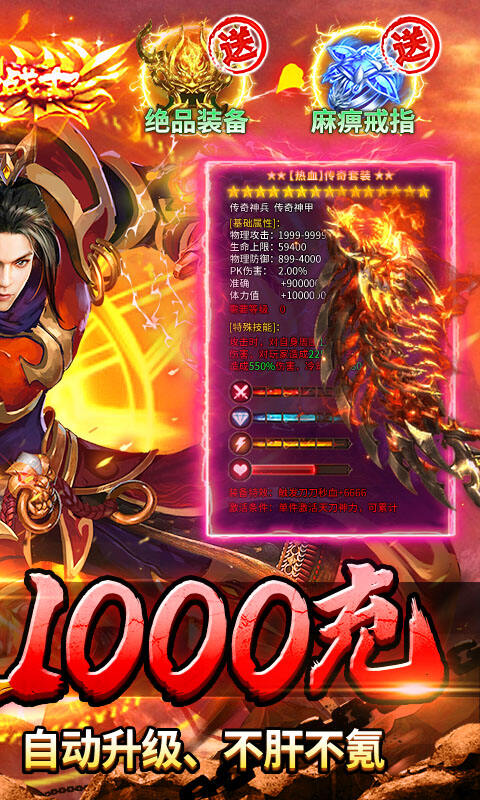 1、红包福利:每天登录游戏免费领取1000红包,激活线上累充 2、上线福利:开局赠豪华礼包,属性大幅提升 3、真充福利:创角签到送真充卡,激活商城积分累充活动 4、自动升级:免费泡点自动升级,不肝不氪,解放双手 5、百万货币:零氪玩传奇,打怪领充值卡、百万元宝、沉默币 6、超值回收:极品装备官方回收,万元首爆疯狂送 7、超高爆率:所有道具全靠打,小怪也能爆神装