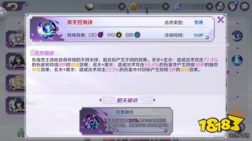 一技能玄水潮带减速,而且范围广很容易命中。二技能黑河葬将使目标进入中毒状态。三技能浑天控海诀有点复杂,会根据之前释放的技能顺序,放出不同技能。简单来说就是,先放一技能和普攻,三技能会强力减速,先放二技能和普攻,三技能会强力中毒,先放一技能和二技能,三技能会冰住对面。反正不管你按出哪个,效果都很强力。