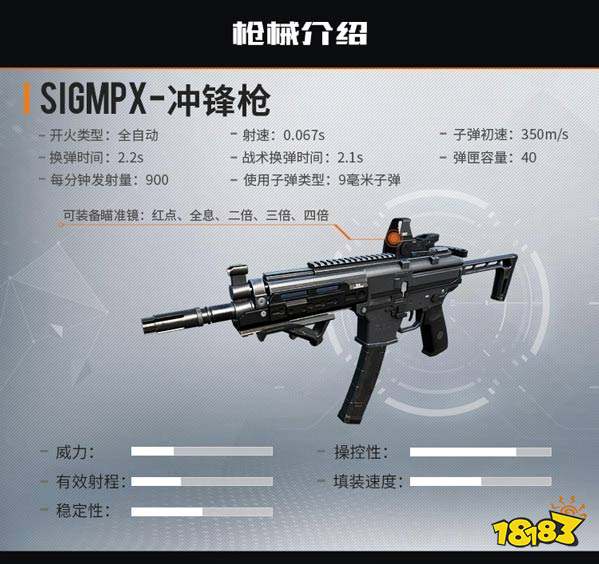 经济实用的近战武器,单发威力较小,射速快,弹匣容量大,后坐力较小,非常适合新手使用。同时大弹匣、高射速、操控性强使得该类枪械在长时间持续输出中拥有较大优势。
