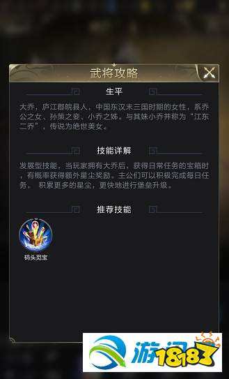 发展型技能,当玩家拥有大乔后,获得日常任务的宝箱时,有概率获得额外的星尘奖励。主公们可以积极完成每日任务,累计获得更多的星尘,可以更快进行堡垒升级。