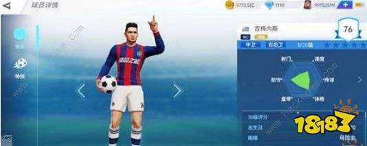 吉梅内斯的30级总评为87。随着经验的提升,他可以给玩家的后防线筑上一道铜墙铁壁。92的盯防,92的铲断,还有90的抢断,成功特训后还有机会解锁禁区铁闸特技,吉梅内斯绝对是游戏里无数前锋的噩梦。玩家在使用时,按住加速施压键上前逼抢会有较高的成功率。但他的防守站位数据一般,容易失位,实战中经常因为逼抢漏人,因此对于上抢时机的把握也有较高要求。玩家不妨为他搭配一个位置意识较强的中卫,以及一个能在其失位时及时补防的防守型后腰。另外,当球队进攻乏力时,其出色的头球能力说不定能够帮助玩家在定位球中取得进球。