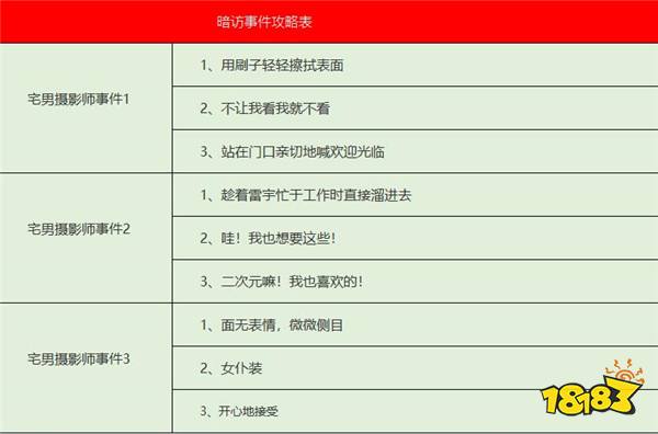 恋与制作人暗访事件之宅男事件答案是小编人为大家带来的,恋与制作人宅男摄影师这件暗访事件有三个,玩家可以通过对话找到答案,下面不妨详细了解下宅男摄影师事件答案吧。