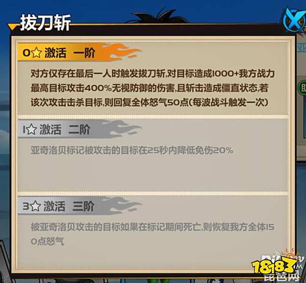 亚奇洛贝的伙伴技能是拔刀斩,无视防御的伤害威力十分强劲,不过要对方仅剩最后一人才会发动,看着像是个补刀技能,但其实在面对单体BOSS战时有妙用,开场一个大拔刀可以让团战更轻松。另外收集他的碎片,将技能升级到2阶后还能让目标降低防御力,大幅提升战斗效率。