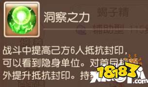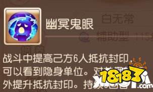 特色技能2:开眼没有单位限制,而是全场开眼,且提高抗封,在对付隐攻以及隐身单位效果奇佳,能大幅提高对隐身单位的作战效率,比如蜃境寻宝第一层精英怪影鬼与90秘境的隐身哪吒。