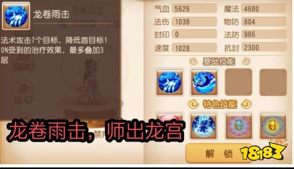 作为水系一员,同样师承龙宫,技能[龙卷雨击]法术攻击7个目标,只是作为柔弱的女儿身,伤害并不突出。拿手技能[清心],净化友方小伙伴的异常状态,如果净化成功的话,3回合内的下一次法术攻击必定可以触发法术连击,这点还是比较好的,算是弥补了一次因为净化而损失的出手机会。