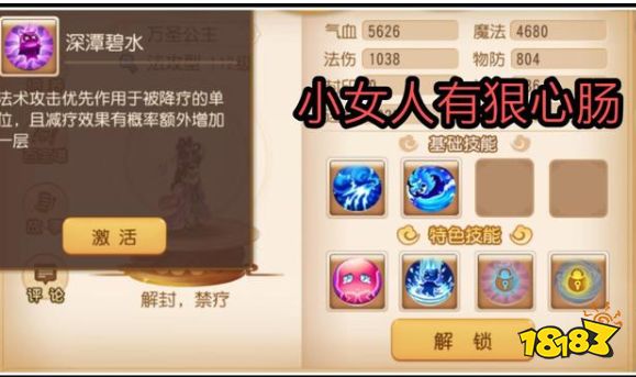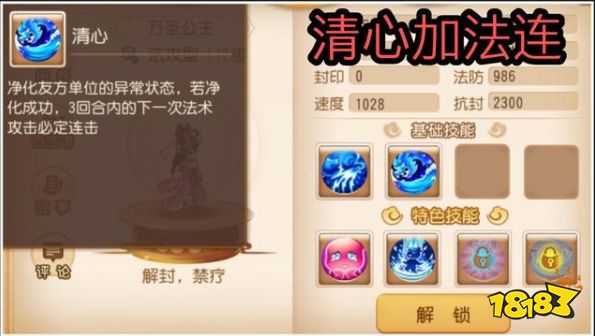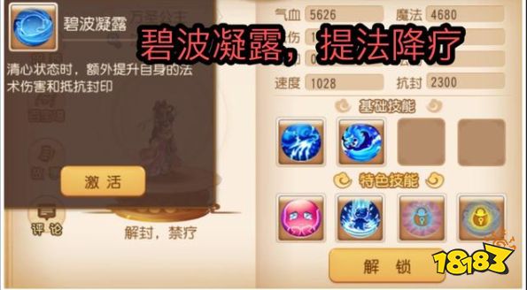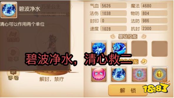 对攻击方面的加成技能[深潭碧水],法术攻击优先作用于被降疗的单位,且减疗效果有概率额外增加一层,克制对面奶妈较多的阵容。同时技能[碧波凝露],使得清心状态时,额外提升自身的法术伤害和抵抗封印的属性。从技能来看,主要靠解除异常状态立足。
