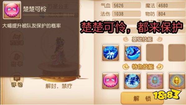 从综合属性上分析,虽然法伤并不高,但考虑到万圣公主本身比许多辅助还要快的超快速度,万圣公主的综合属性上已经能排入助战中上游水准。基础技能方面, 只要有两个单位被毒或者有任何单位被封都会出手清心,严里容不得小伙伴有任何负面状态。只有在小伙伴都在正常状态时,她才会使用龙卷雨击,是一个不爱打架的主。同时因为长得漂亮的原因,触发保护的概率相当高,因此在面对万圣公主时攻宠点杀收益并不太高,因为多重助战的保护使得点杀很难成功。 在清除负面状态上,她走得很远,一回合可以清除两个单位全部负面效果,无论对降疗还是封系都有着不错的克制作用。