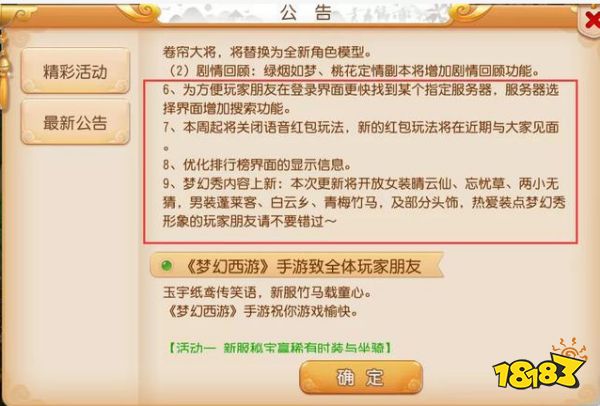 为了更加方便玩家在登录界面找到指定服务器,在本次更新后服务器选择界面将增加搜索功能,以后大家再也不用去手动筛选寻找服务器啦;同时游戏内将会关闭语音红包玩法,近日内将会上线新的红包玩法与大家见面。
