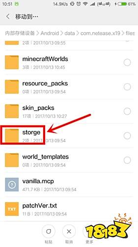 选择存档文件夹,剪切移动到对应位置,先点击Android文件夹,然后点击date文件件,依上面的路径来找到worlds文件夹,把存档文件件放在这: