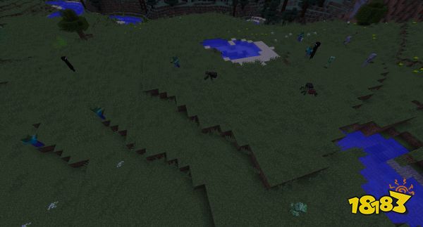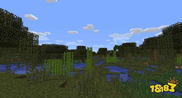 如果发现周围的树、草地和水颜色较深,树上还挂着很多藤蔓,地上还有坑坑洼洼的水坑,那么你的出生点就是沼泽了,这里不仅会生成很多甘蔗,这里也是唯一能大量生成史莱姆的地方。
