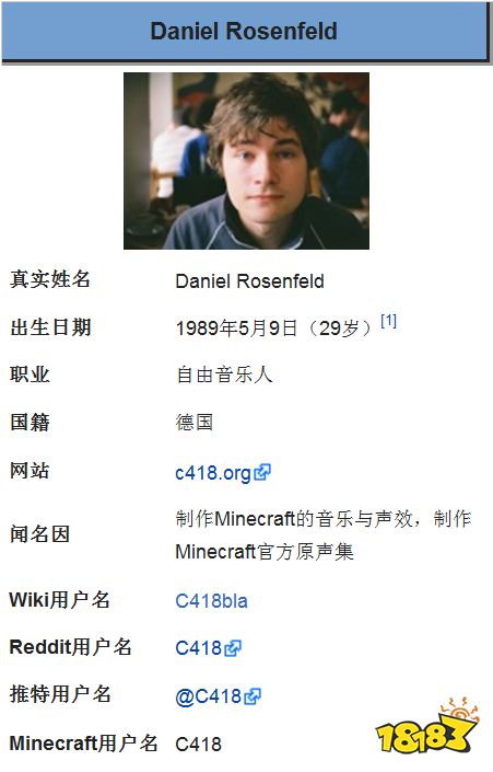 虽然C418看上去像是他的生日,但是丹尼尔·罗森菲尔德其实在1989年5月9日出生于德国东部(他本人确认为1989年出生,而不是网上流传的1986年)