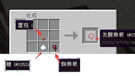 现在制作发酵蜘蛛眼,发酵蜘蛛眼的制作需要15个蜘蛛眼、4个灰色蘑菇以及7个糖,蜘蛛眼顾名思义就是蜘蛛的眼眼睛,所以我们需要杀蜘蛛,蜘蛛一般会在洞穴蜘蛛刷新,糖需要从甘蔗中获得,然后我们在工作台中随便放入蜘蛛眼、糖以及灰色蘑菇就能获得发酵蜘蛛眼。