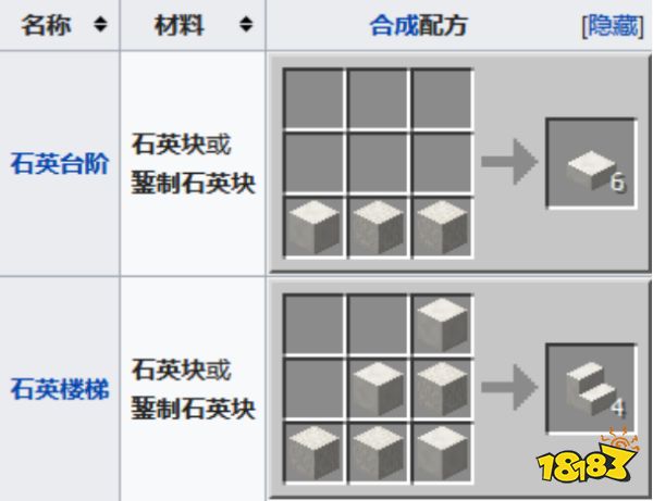 石英可以合成台阶和石英楼梯,其中石英台阶需要三块石英石,而石英楼梯则需要六块石英块。