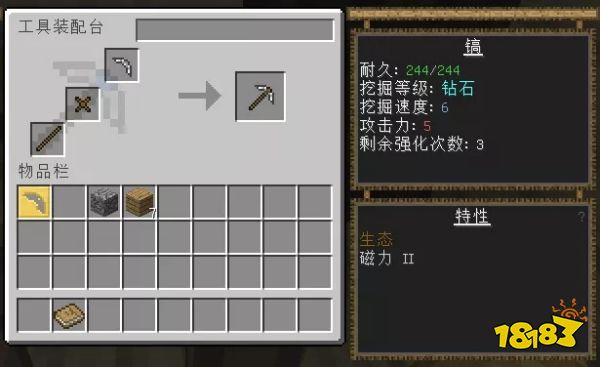 准备好所有的部件之后,就可以在工具装配台组装成品了!可以看到这次制作的匠魂版本的铁镐的挖掘等级是钻石,和原版的铁镐是同一等级。虽然它的耐久比原版的少一点,但这把铁镐不仅有木头带来的“生态”效果,还带有铁赋予的“磁力”效果,让它可以自动吸引附近的物品!