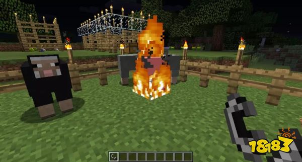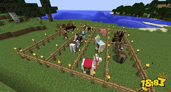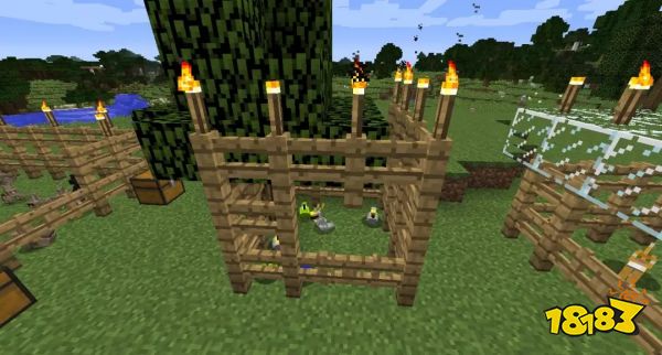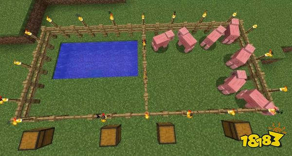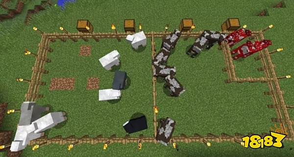 3.选择适合的大小范围摆放栅栏并安装至少1个栅栏门,完成小型的养殖圈的搭建。玩家可以在栅栏上尽可能摆放较多的火把(可以根据动物的大小、数量、种类搭建相应的养殖圈)。有余力的玩家可以在所有养殖圈外围一个大的栅栏圈,将所有小养殖圈囊括在内。在各种动物的养殖圈搭建完之后,在每个养殖圈的栅栏门附近摆放1~2个箱子,以便随时储存和放取饲料、掉落物和工具等。