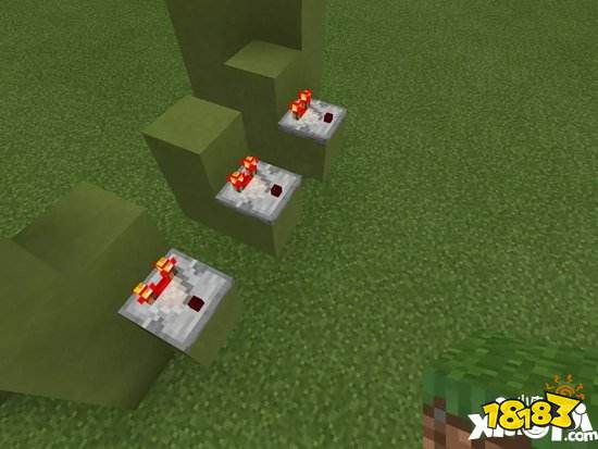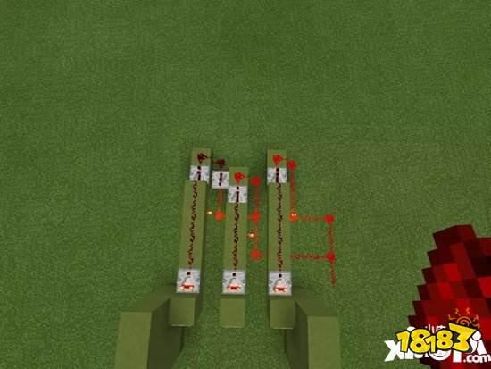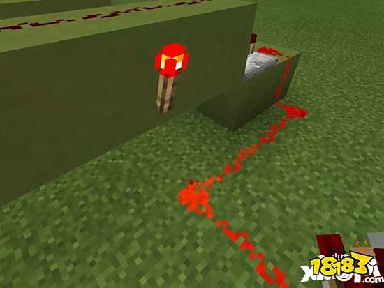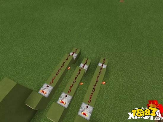 3、在这列方块的右下方也挖掉一排1×x-3的方块,并在里面放置红石粉,红石粉要与红石中续器前面的红石粉连接在一起。