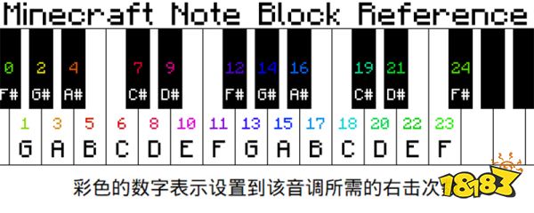 音符盒共有24个音名,两个音阶,每个音阶十二个音名:1,#1,2,#2,3,4,#4,5 #5,6,#6,7。每当音符盒发声时,其上部都会弹出一个音符的颗粒效果;音符的颜色仅取决于发出声音的音高。