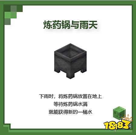 如果你一桶水都没有,又不想到四处去寻找水源,那就可以花费一些铁锭造个炼药锅在雨天接水!