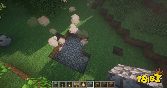 但是,温泉也不能脚下直接是火烤吧?所以我们在篝火上一格加上圆石块,作为温泉的下壁。