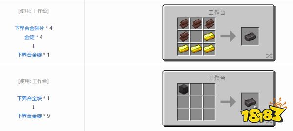 我的世界下界合金锭由下界合金碎片和金锭合成获得,用于将钻石制品升级为下界合金制品。