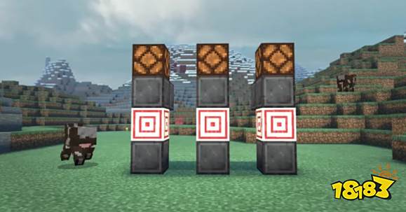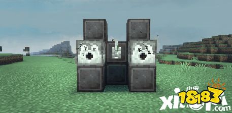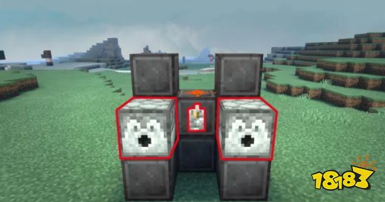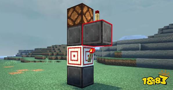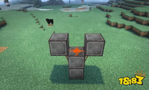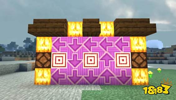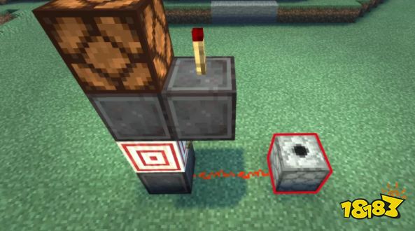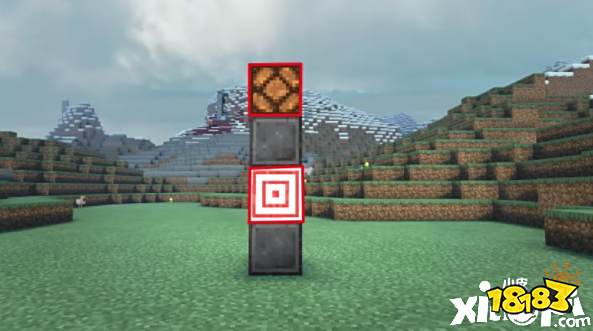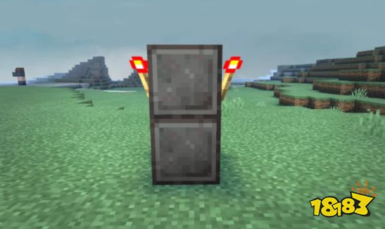 在离标靶一段距离的空地上,按照下图所示放置两个普通方块,并在上面的普通方块两侧放上红石火把