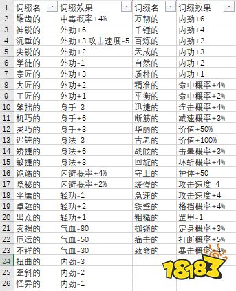 不同的词缀带来不同的效果,然后在下就比较好奇的想知道《模拟江湖》中到底有多少词缀,然后的然后,就在1.1.7版本(bug江湖)中通过模拟器脚本进行了大量样本的搜查,得出了部分词缀名及其效果,看着现在已知的词缀个数,预估起码得八十多个词缀以上,《模拟江湖》策划大大们真的用心了。下面就是目前已知的词缀名,有知道别的词缀名的朋友们可以进行补充说明。