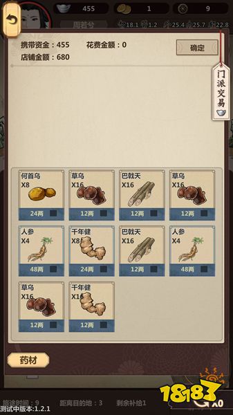 10.远行第一个能卖东西的商店只有556银子(差不多,记不大清了),所以开始的布和瓷器不要买太多,会卖不出去的,瓷器和布的收益是0.5倍,所以买300多到400两的东西就差不多了。卖马有二个商店,所以可以全买光。