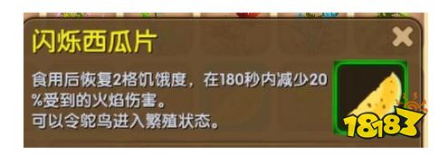 四个西瓜片加一个黄钟花合成闪烁西瓜片,两个闪烁西瓜片喂两只鸵鸟,喂食的时候鸵鸟身上会有红心飘出,当两只鸵鸟都有红心飘出时,就会生鸵鸟宝宝啦~