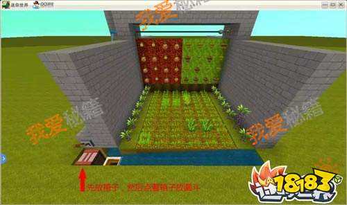 这时候准备2个漏斗和2个大箱子(准备两份是因为一边一块地),在边缘砸出一格做水槽并放上水,在水槽的另一边放上大箱子和漏斗(先放箱子,然后漏斗对着箱子放置);
