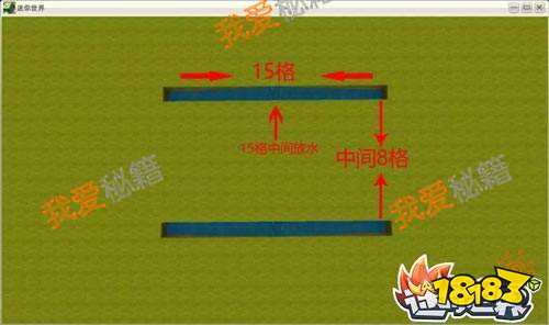 先挖一个长度为15格的水槽,中间空8格再挖个15格水槽;
