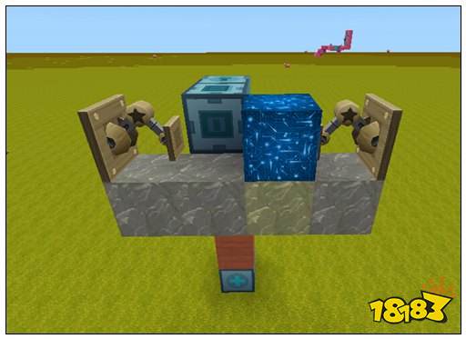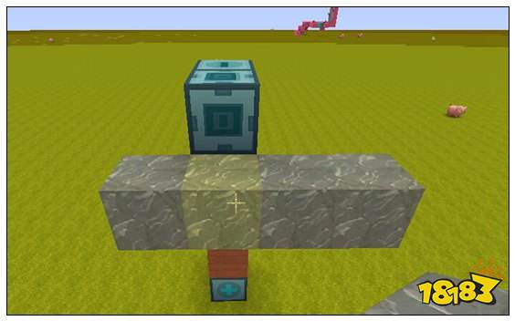 4、在滑动方块的后方往下一格的位置放上横着的四个岩石(自然生成的方块),这个是用来放机械臂和电石块的,控制滑动方块的通电情况;